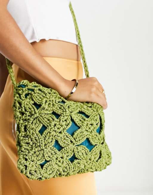 SVNX - Crossbody tas van gevlochten katoen met houten handvat in groen