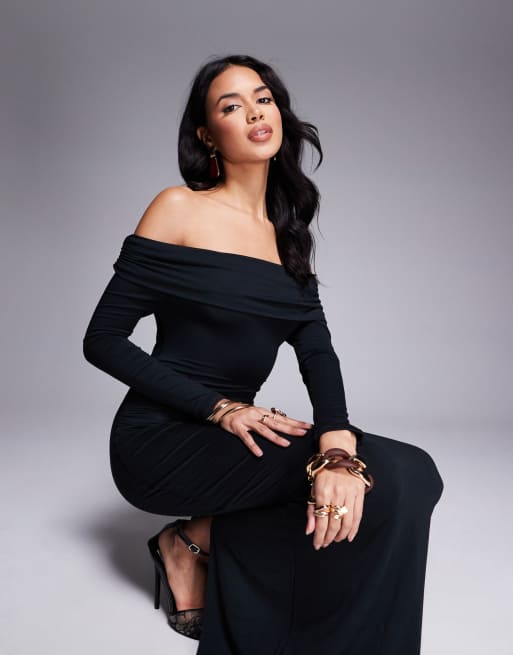 Tala - 365 - Maxi-jurk met rimpeleffect en blote schouders in zwart