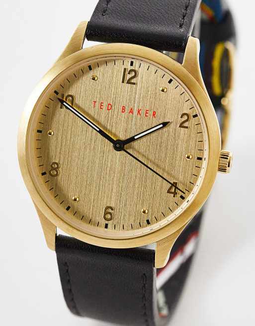 Ted Baker - Horloge met goudkleurige wijzerplaat en leren bandje met kiezelstructuur in zwart