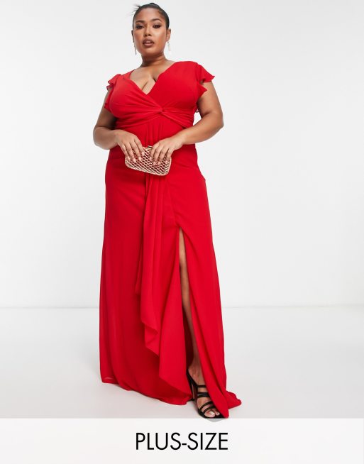TFNC Plus - Lange bruidsmeisjesjurk met fladdermouwen en ruches in rood