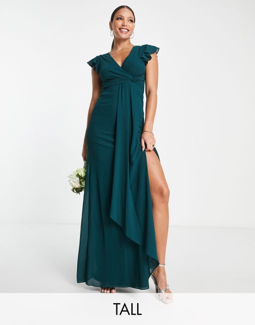 TFNC Tall - Bruidsmeisjes - Maxi-jurk met fladdermouwen en ruches in smaragdgroen