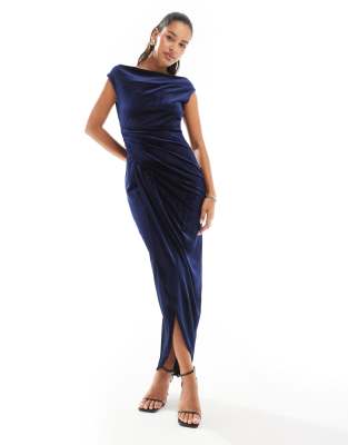 TFNC - Fluwelen maxi-jurk met schuine hals in donker marineblauw