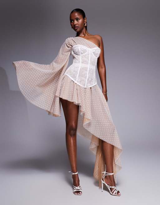 The Dolls House Circa - Evangeline - Asymmetrische maxi korsetjurk met stippen in ivoorwit