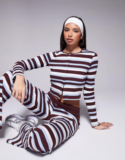 The Frolic - Exclusive - Geribbelde gestreepte top met knoopsluiting en lange mouwen in blauw en chocoladebruin, deel van co-ord set