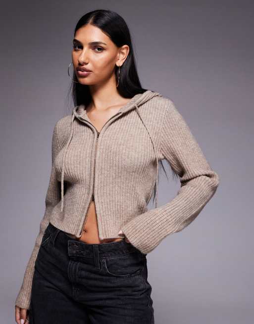 The Frolic - Exclusives - Geribbeld gebreid vest met capuchon en dubbele rits in lichtbeige