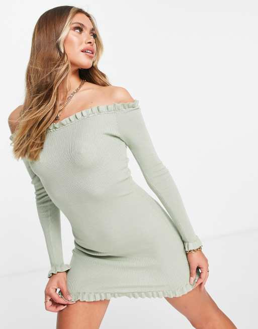 Threadbare - Brooke - Aansluitende geribbelde bardotjurk met ruches aan de randen in saliegroen