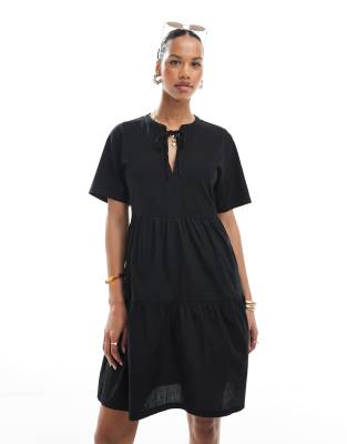 Threadbare - Gestreepte mini-jurk van katoenrijke stof met korte mouwen en keyhole in zwart