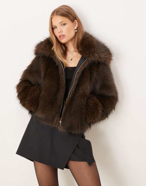 Threadbare - Kort jack van imitatiebont met kraagje in chocoladebruin