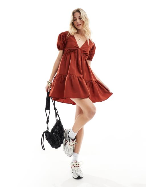 Threadbare - Skaterjurk van popeline met V-hals in roestbruin