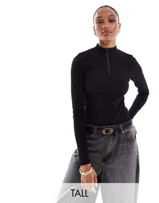 Threadbare Tall - Geribbelde, hoogsluitende body met korte rits en lange mouwen in zwart