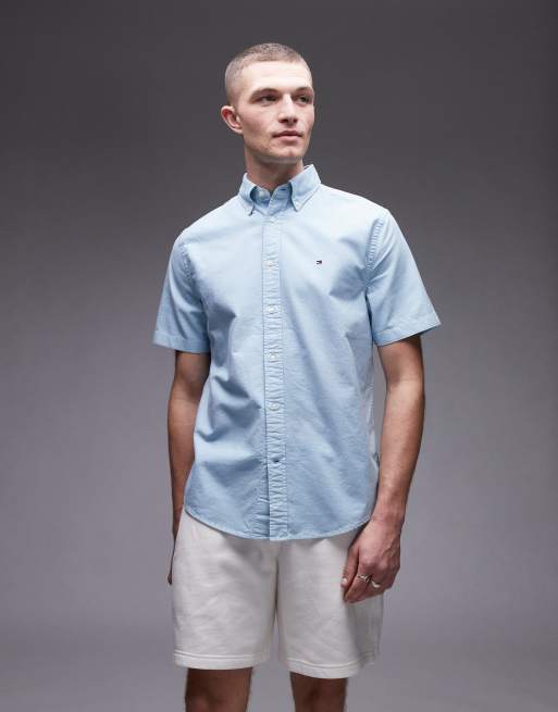 Tommy Hilfiger - Linnen Oxford overhemd met korte mouwen in zachtblauw