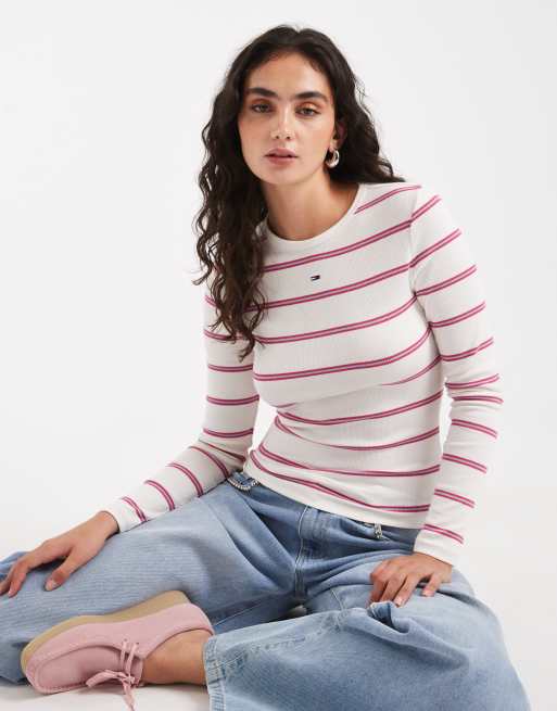 Tommy Jeans - Geribbeld T-shirt met badge, lange mouwen en felroze strepen
