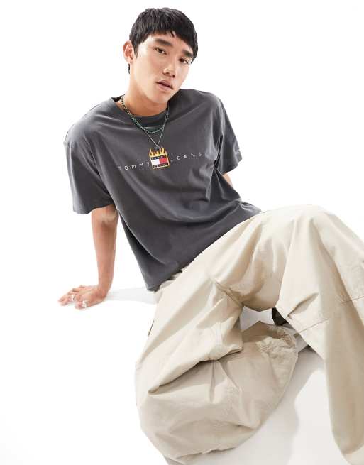 Tommy Jeans - Ruimvallend T-shirt met lineair logo met vlag met vlammen in antraciet