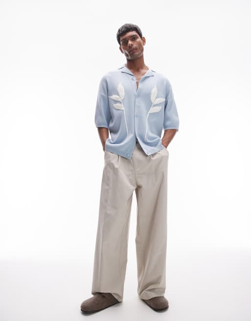Topman - Gebreid overhemd met reverskraag en bloemenborduursel in blauw