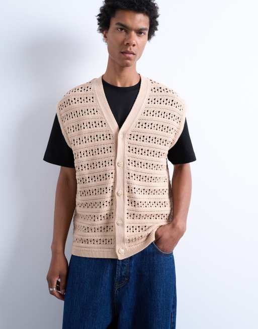 Topman - Gebreide tanktop met ruimvallende pasvorm en knoopsluiting in stone