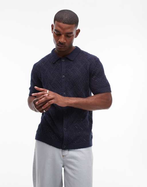 Topman - Gehaakt overhemd met knoopsluiting in marineblauw