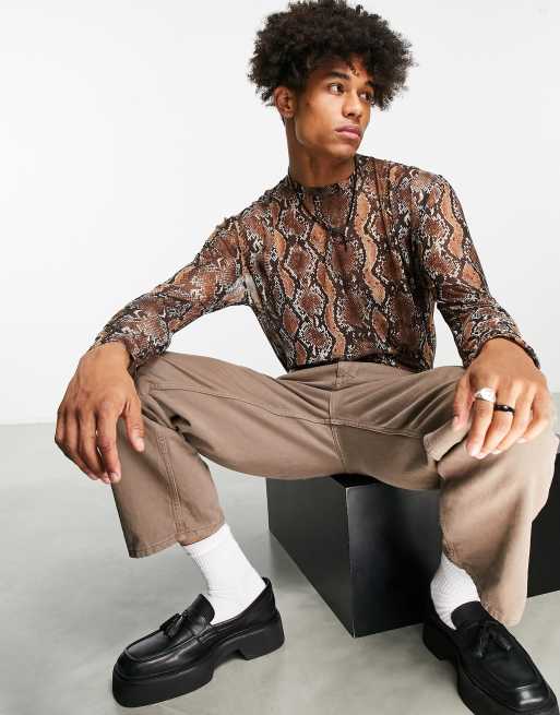 Topman - Klassiek mesh T-shirt met lange mouwen en slangenprint in bruin