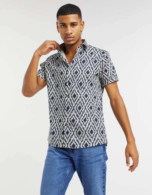 Topman - Overhemd met korte mouwen en geometrische print in marineblauw