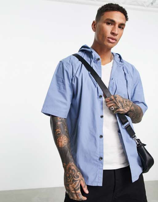 Topman - Oversized overhemd met capuchon en korte mouwen in blauw