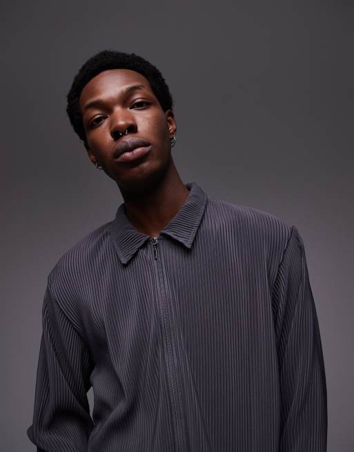 Topman - Oversized polo met lange mouwen, rits en plissé in antraciet
