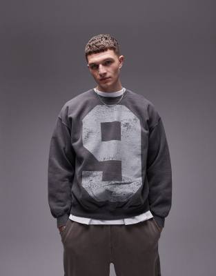 Topman - Oversized sweatshirt met 95-print op de voor- en achterkant in zwart met wassing