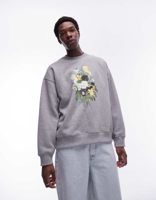 Topman - Oversized sweatshirt met bloemenborduursel-print in gemêleerd grijs