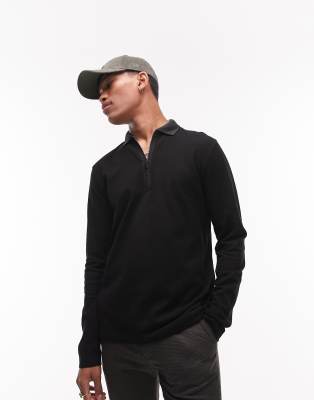 Topman - Polo met lange mouwen en contrasterende bies met rits in zwart