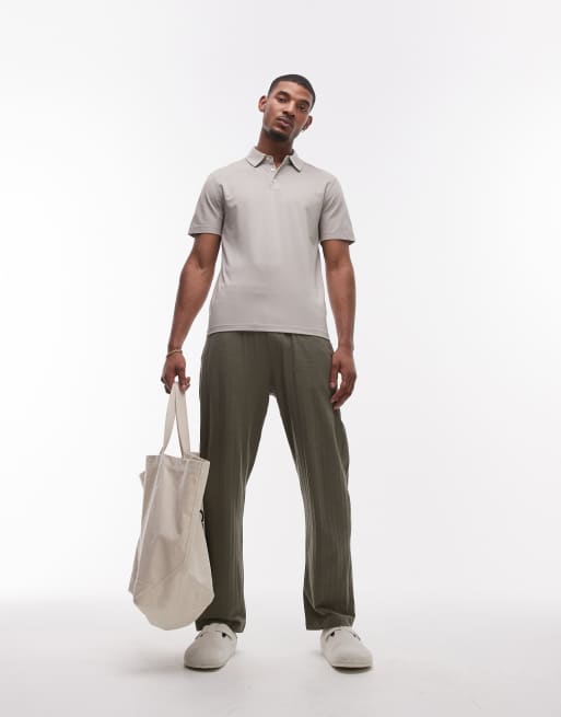 Topman - Rechte plissé joggingbroek van seersucker in kaki