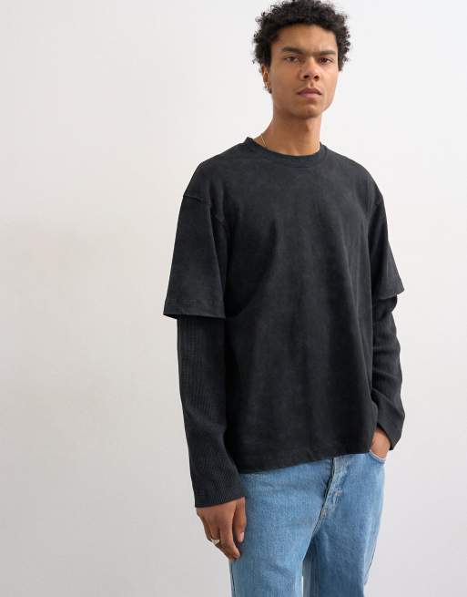 Topman - Ruimvallend gelaagd T-shirt met wafelmouwen in zwart met wassing