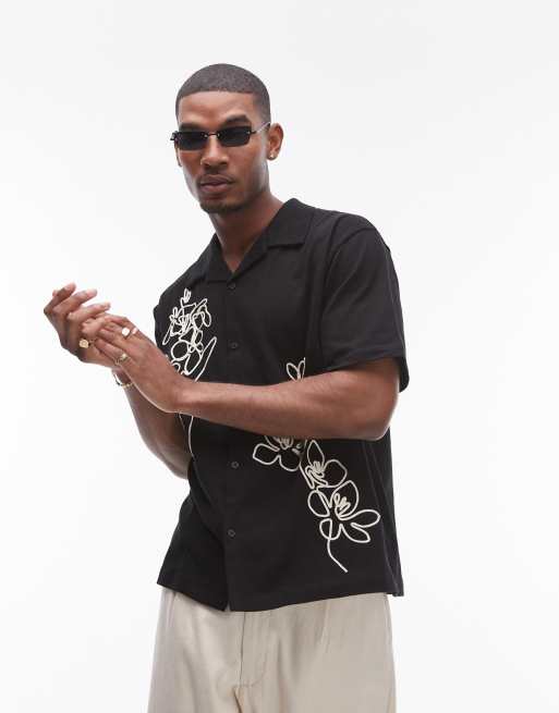 Topman - Ruimvallend jersey overhemd met knoopsluiting en borduursel in zwart