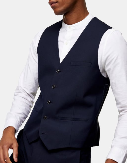 Topman - Skinny, single breasted pak met revers met inkeping en gilet in marineblauw