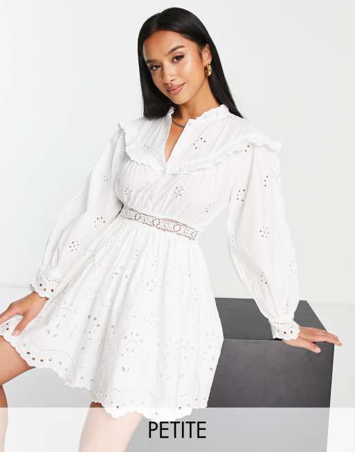 Topshop Petite - Mini jurk met broderie en grote kraag met ruches in wit