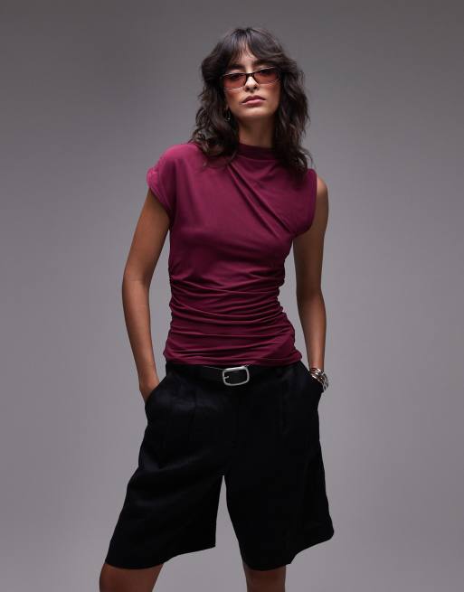 Topshop - Asymmetrische tanktop met hoge hals en geplooide details in bordeauxrood