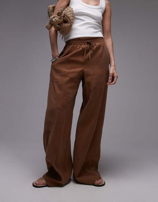 Topshop - Broek met elastische taille en wijde pijpen in roestbruin