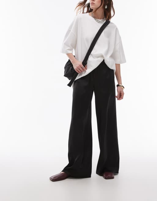 Topshop - Broek van satijn met wijde pijpen en gestrikte taille in zwart