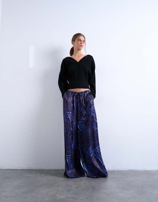 Topshop - Broek van satijn met wijde pijpen en print in blauw en bordeauxrood