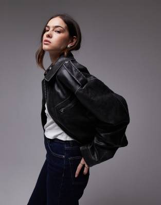 Topshop - Cropped bomberjack van imitatieleer met kraagje in zwart