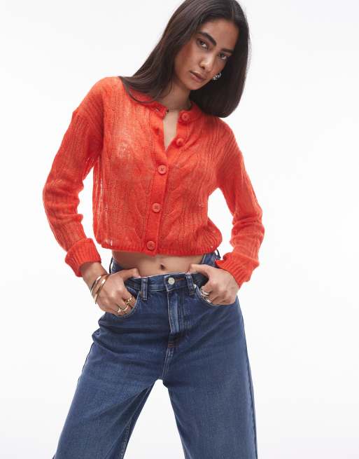 Topshop - Doorschijnend gebreid vest met kabels in rood