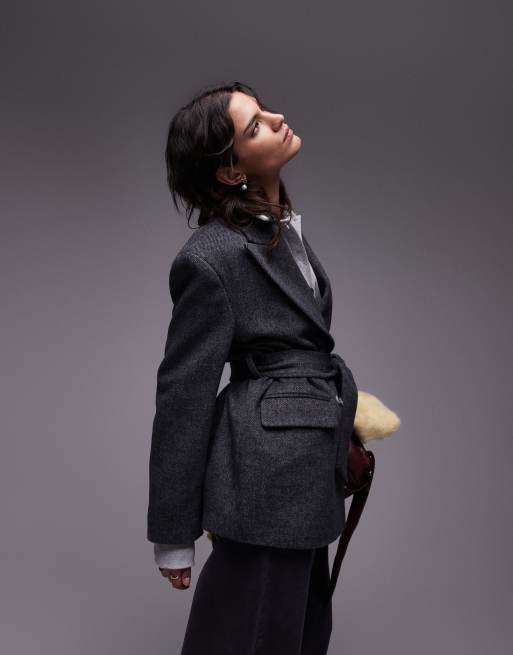 Topshop - Double breasted blazerjas van keperstof met riem in antracietgrijs