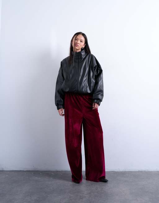 Topshop - Fluwelen broek met wijde pijpen en elastische taille in bordeauxrood