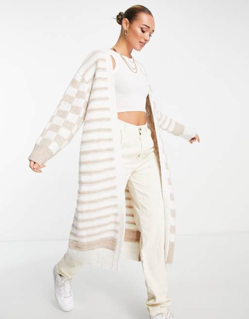 Topshop - Gebreid lang vest met dambordpatroon en strepen in crème
