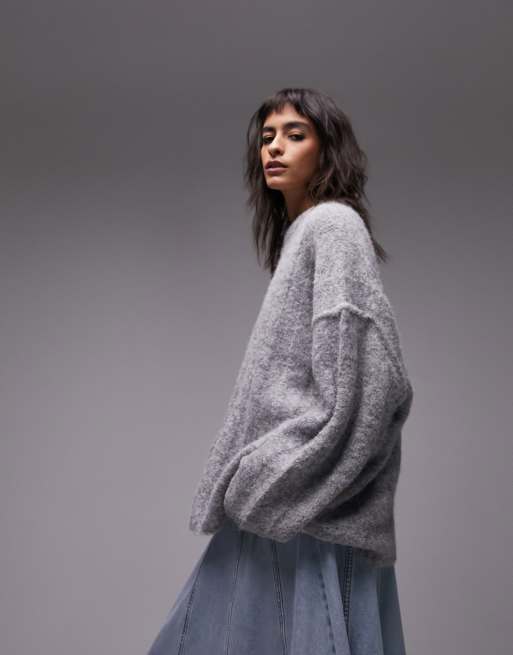 Topshop - Gebreide ruimvallende pluizige trui met zichtbare naad en brede ribbels in grijs