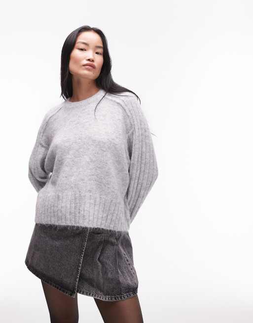 Topshop - Geribbelde gebreide ruimvallende trui met ronde hals in grijs