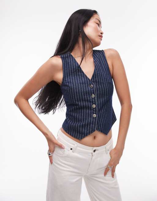 Topshop - Gestreept denim gilet met verstelbaar riempje op de achterkant in indigoblauw