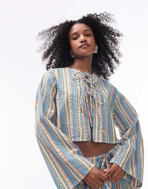 Topshop - Gestreepte strandtop van seersuckerstof met gestrikte voorkant in multi, deel van co-ord set