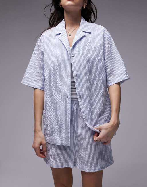 Topshop - Korte pyjamaset met overhemd en short met textuur en strepen in blauw