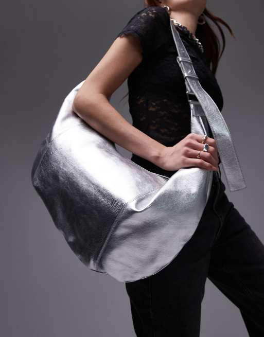 Topshop - Lana - Oversized leren schoudertas met lage ronde bovenkant in zilver