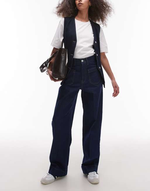Topshop - Losvallende jeans met halfhoge taille en opgestikte zakken in rinse indigo