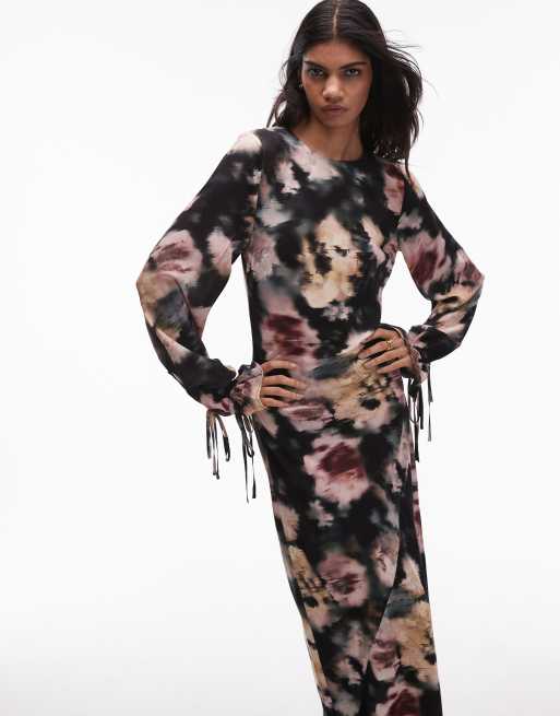 Topshop - Maxi jurk met gestrikte ballonmouwen in zwart met bloemenprint