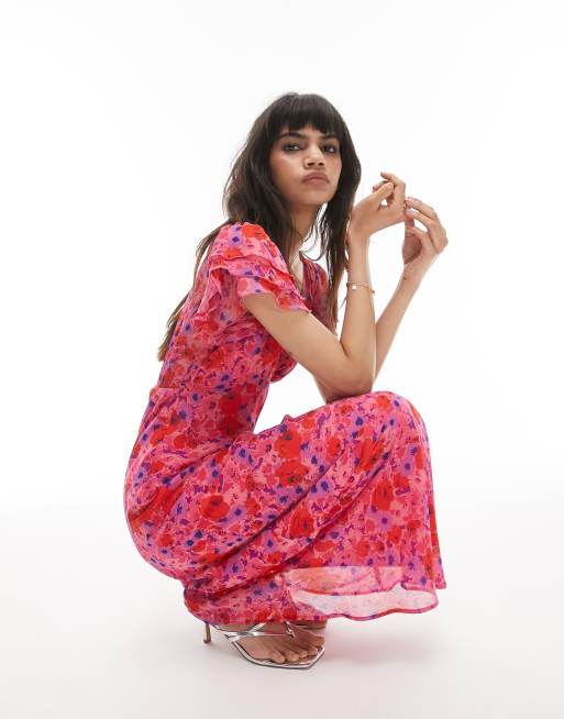 Topshop - Maxi jurk met ruches aan de mouwen en bloemenprint in roze